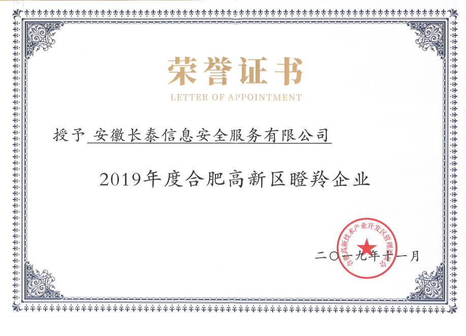 2019年,11月20日,合肥高新区2019年高成长企业榜单正式发布,高新区共认定了502家高成长企业,其中雏鹰企业275家、瞪羚培育企业72家、瞪羚企业149家、潜在独角兽企业3家、独角兽企业1家、平台型龙头企业2家。作为其中的高科技企业——安徽华体会在线登陆-华体会(中国)成功入选瞪羚企业榜单。